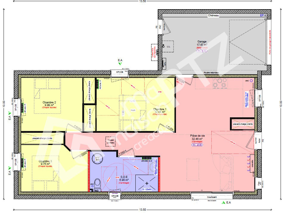 Le modèle Alina est une maison de plain-pied de 72 m², conçue pour allier accessibilité, fonctionnalité et confort, tout en répondant aux normes PMR (personnes à mobilité réduite).